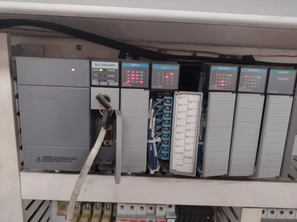 This machine from 2003 had SLC500 AB PLC with an old HMI to control a VFD that moves a main shaft with cams (No Servo). 3 years stocked not working.